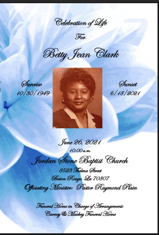 Betty Jean Clark, Age 71 , Passed away on June 18, 2021 in Baton Rouge La. She was preceded in death by her parents Olevia Johnson, father Herman Johnson, two brothers Jesse Hogan Jr and Irwin Hogan, nephew Irwin Hogan Jr, & Grandson Austin Yaghi. She was survived by her husband Mose G Clark, her two daughters Carlette Hoagland and Laura Washington Yaghi, her niece who was more like a daughter Antionette Johnson, her five …