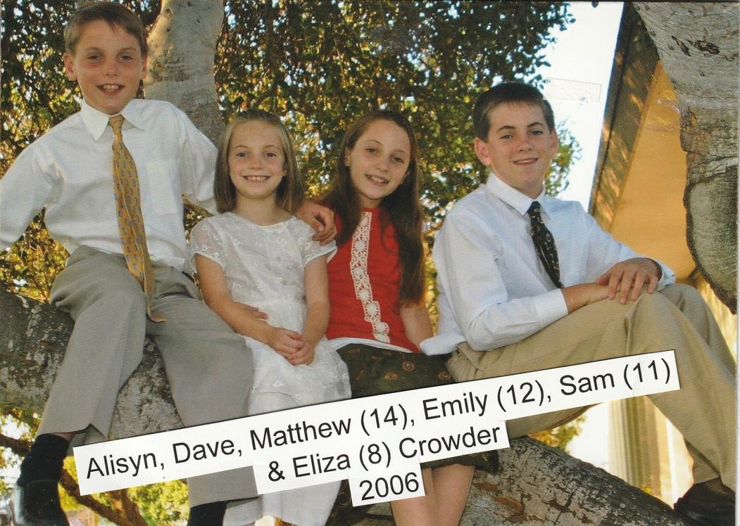 Dear Crowder family, Just want you to know how much I am thinking of you. I hope it's okay that I posted these Christmas card pictures of you. I was hoping that they didn't post yet and I was going to get your permission. It has been a lot of fun going through all my old scrapbooks and pulling them back out. Your mom, my cousin Alisyn, is fantastic at sending Christmas cards and this is how I have watched you grow up over the years. Your have many, many cousin cheerleaders and great aunts and uncles, that are so proud of each and everyone of you! Our hearts go out to each of you at this time as you mourn the loss of your wonderful sister Emily! Alisyn and Dave we love you so much and our hearts are breaking with you! The knowledge of forever families is what keeps so many of us going! I know it's what keeps me going. Love you all so much! Thanks for sharing your lives with us! We look forward each and every year to seeing how you have changed and the fun additions to the family! Much love! Heartfelt prayers being sent your way! Love always, Julie H. Ottley