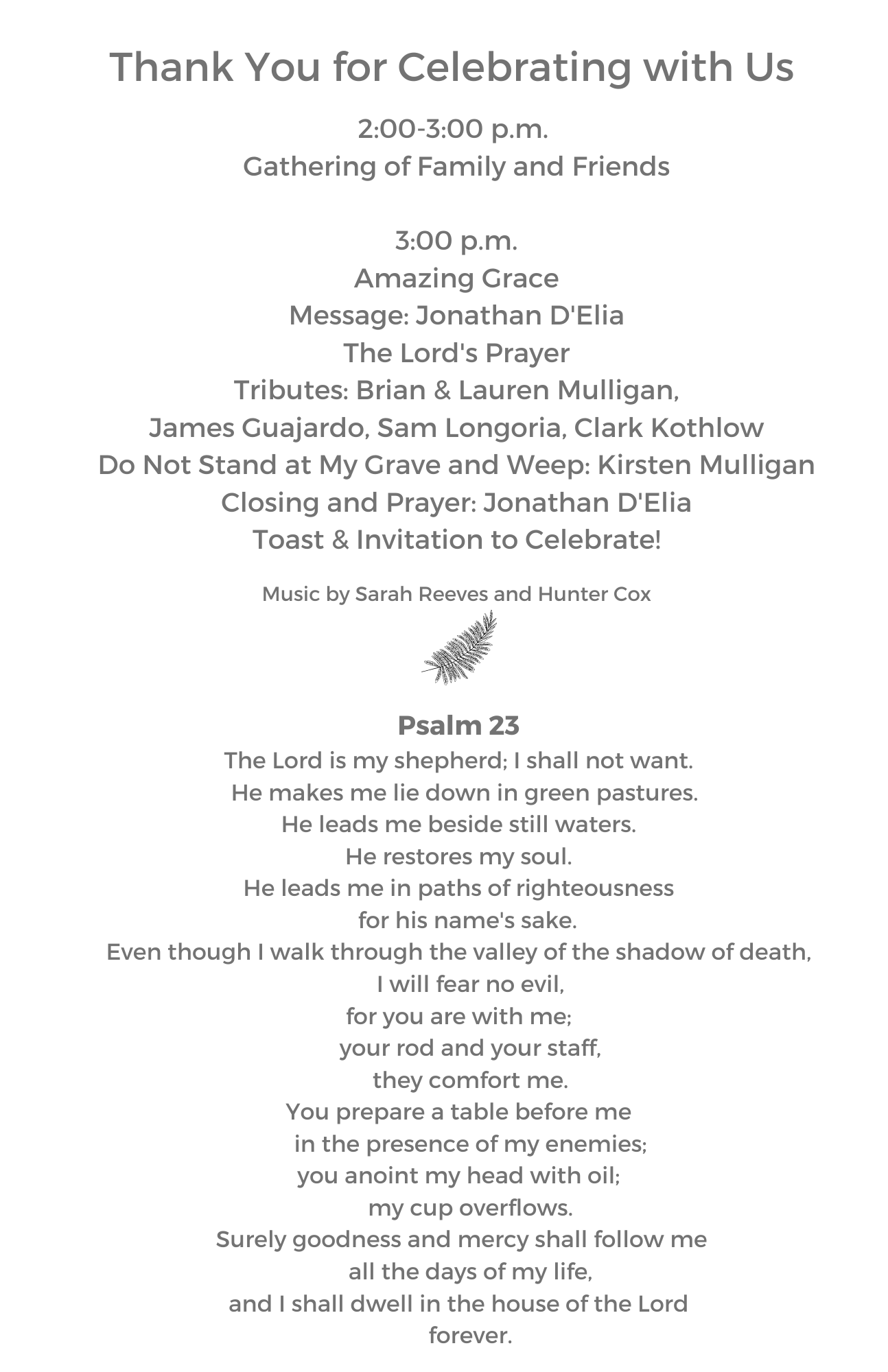 Thank you for joining us for Eric’s Celebration of Life. If the parking lot is full, for your convenience, a shuttle will run continuously between 2:00 and 5:00 p.m. from a nearby location.