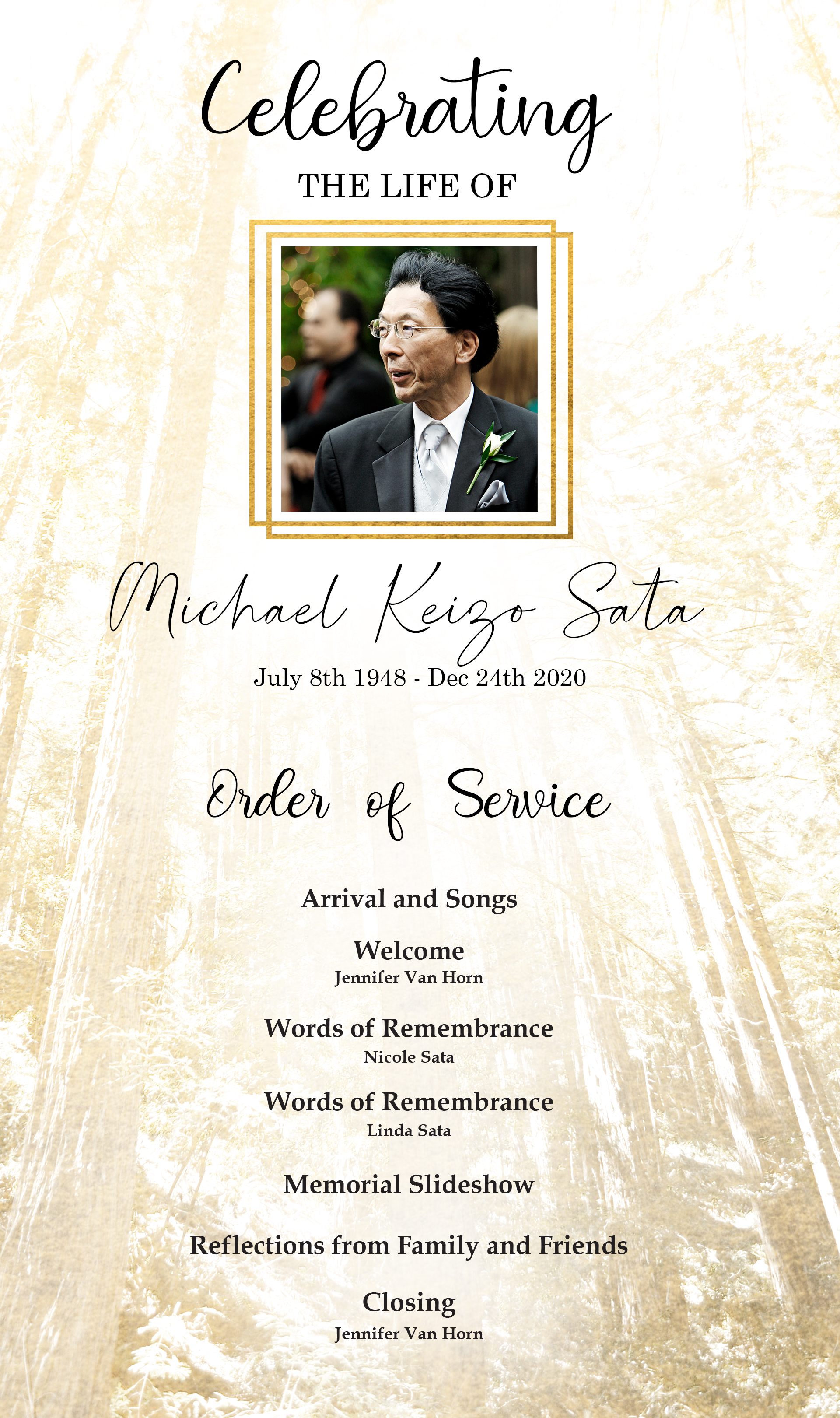 The Ceremony of Life for Mike will be held virtually. If you have any photos or videos you would like included in the celebration slide show, please post them here in memories, or email Jennifer at jenkvanhorn@gmail.com. Thank you and we look forward to seeing you all there.