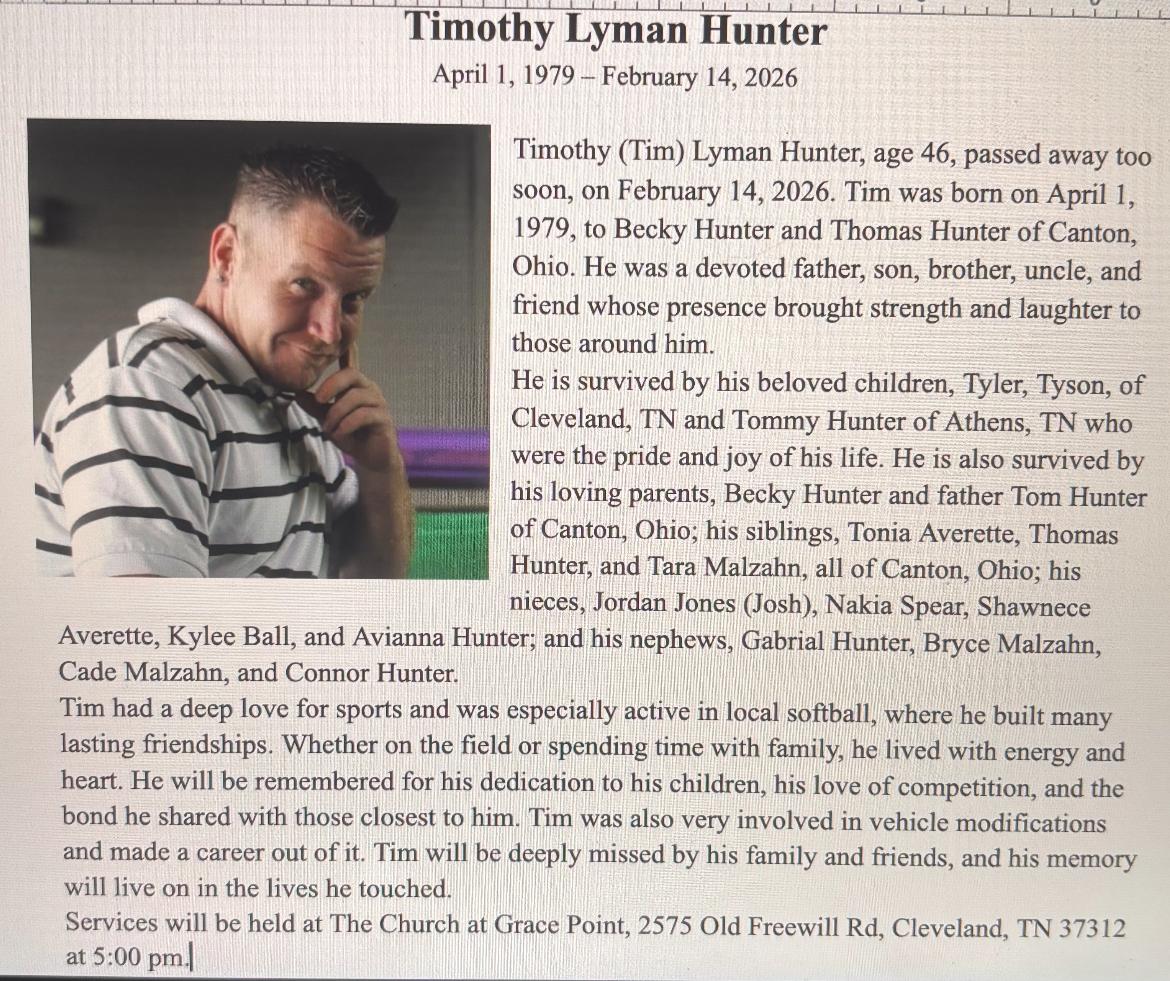 Timothy (Tim) Lyman Hunter, age 46, passed away too soon, on February 14, 2026. Tim was born on April 1, 1979, to Becky Hunter and Thomas Hunter of Canton, Ohio. He was a devoted father, son, brother, uncle, and friend whose presence brought strength and laughter to those around him.